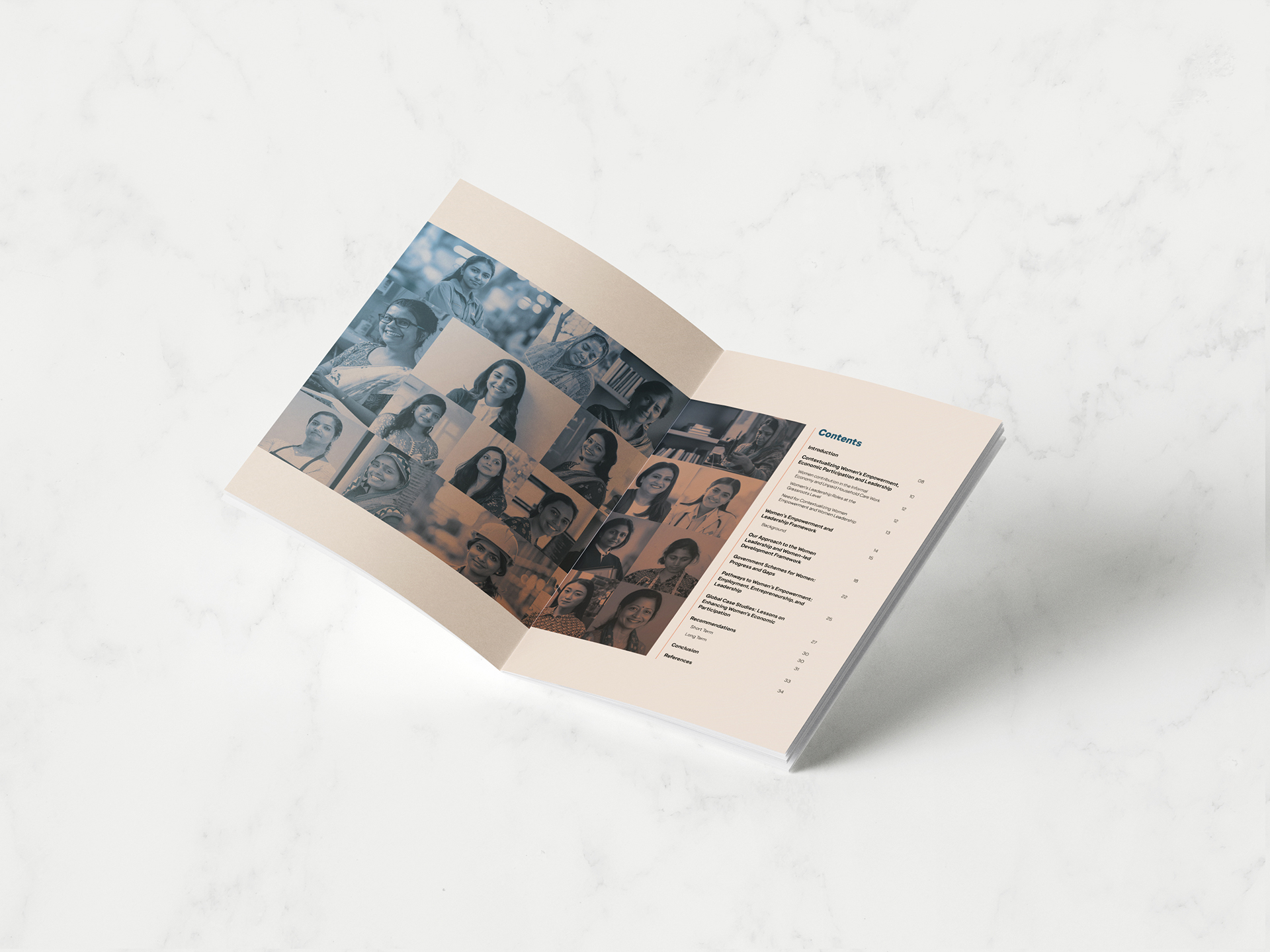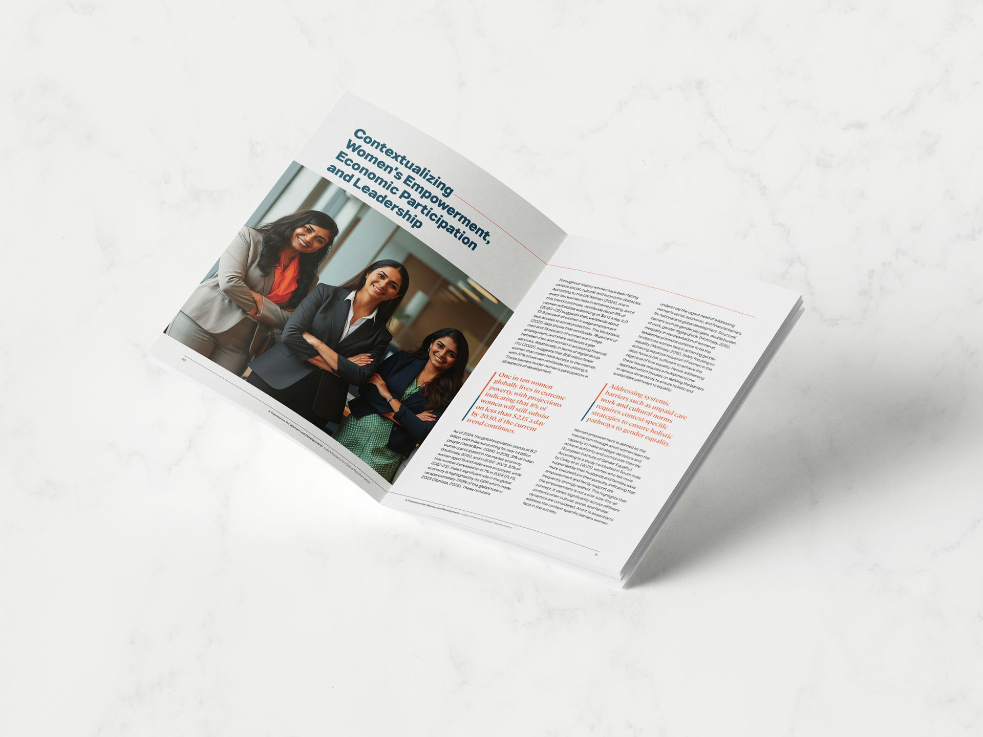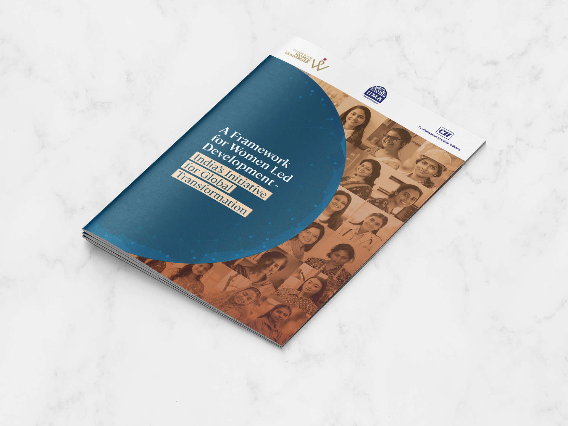 The design of the report, “A Framework for Women Led Development – India’s Initiative for Global Transformation,” is a visual celebration of empowerment and inclusivity. The cover features a dignified, modern layout that blends bold typography with a digital motif and sepia-toned portraits of diverse Indian women, symbolizing progress and representation. Inside, the report maintains a clean, accessible structure with a calm color palette and thoughtful typography, balancing professionalism with warmth. The consistent use of women’s imagery reinforces the theme of inclusion, while the well-organized layout ensures clarity and ease of navigation