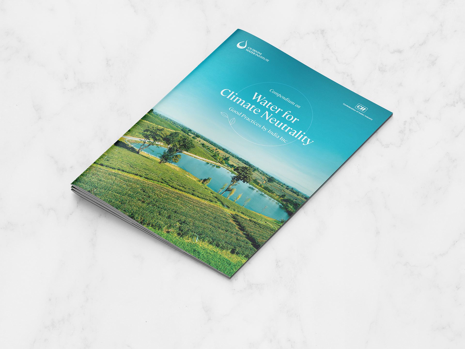 We designed the CII Triveni Compendium on Water for Climate Neutrality to visually capture the vibrancy and good practices of India Inc. The cover features a serene landscape with a river winding through lush green fields under a clear sky, symbolizing climate balance and environmental harmony. Inside, the use of blues and greens, wave motifs, and clear layout structure lends the report a fresh yet professional aesthetic. Thoughtfully curated images and intuitive design elements enhance readability, making the content both engaging and informative.