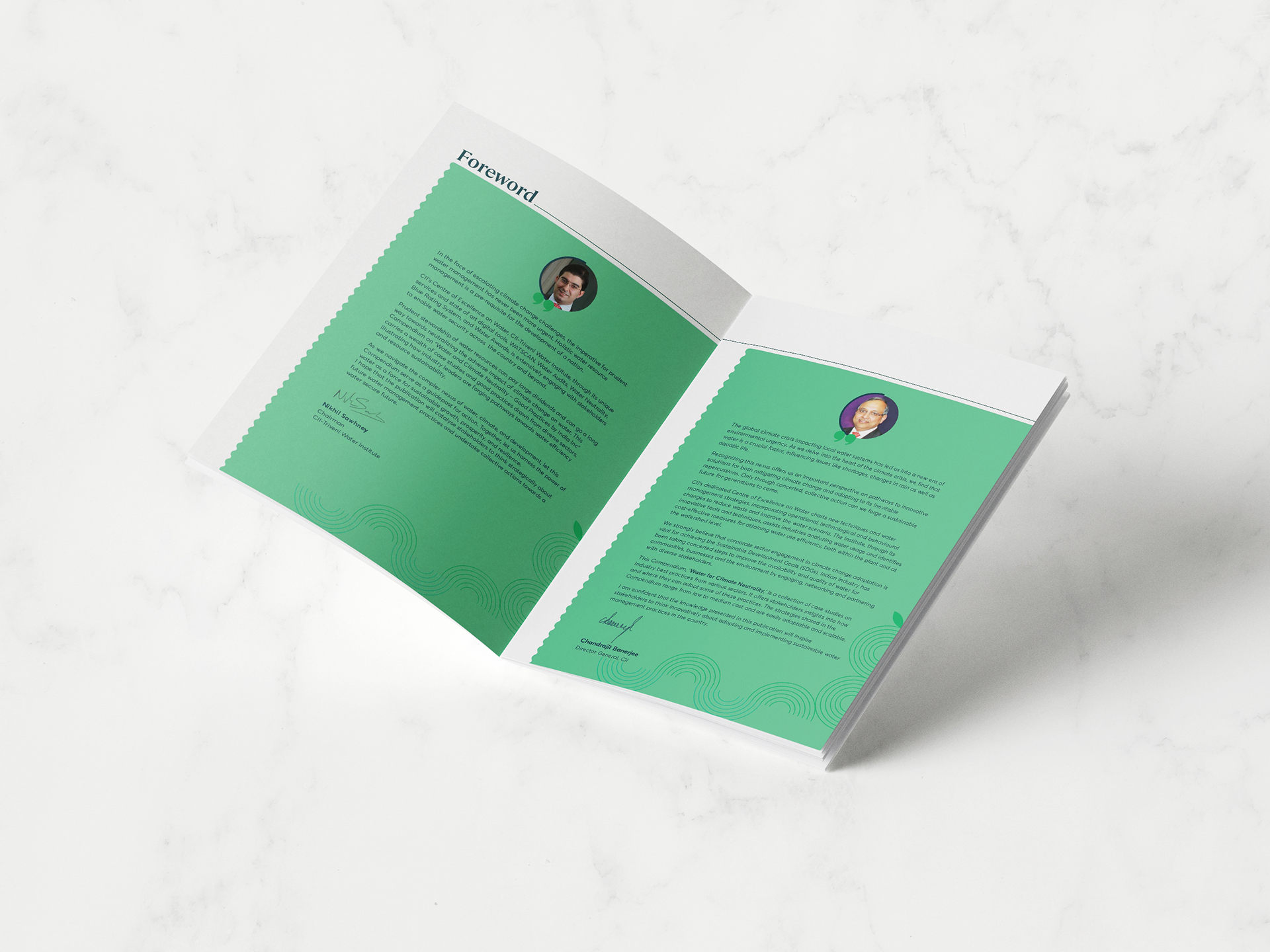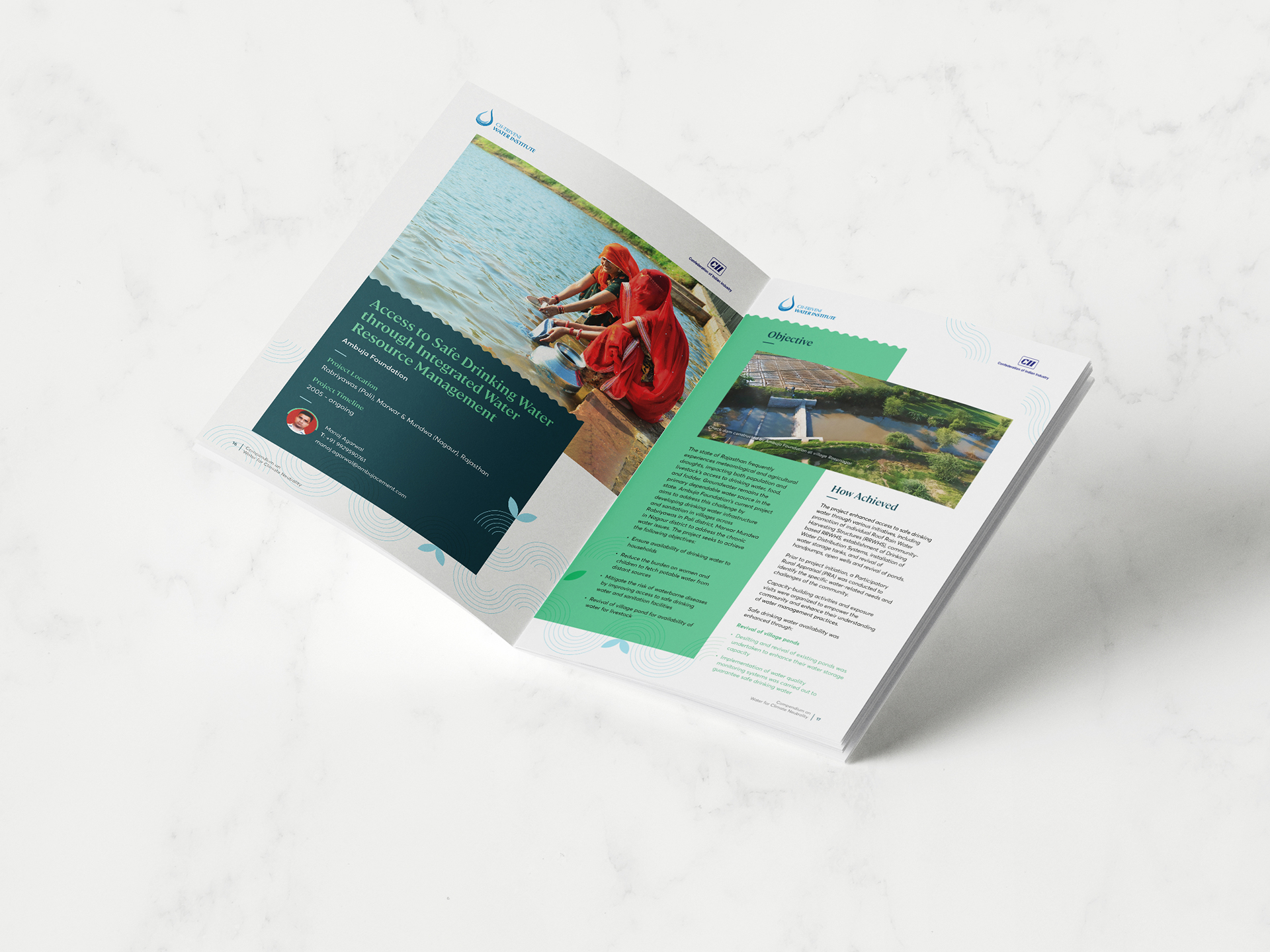We designed the CII Triveni Compendium on Water for Climate Neutrality to visually capture the vibrancy and good practices of India Inc. The cover features a serene landscape with a river winding through lush green fields under a clear sky, symbolizing climate balance and environmental harmony. Inside, the use of blues and greens, wave motifs, and clear layout structure lends the report a fresh yet professional aesthetic. Thoughtfully curated images and intuitive design elements enhance readability, making the content both engaging and informative.